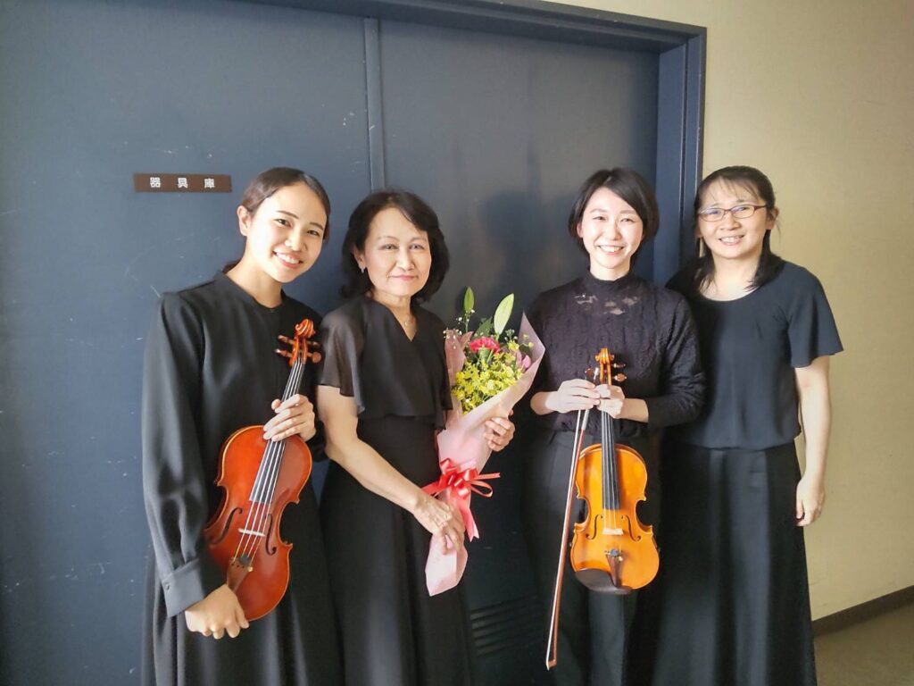 今回は私の教室で育った 堤聖子さん 木原雅代さん、室屋 友花さんと一緒に演奏することができました。友花さんは川辺フィル創立と共に出来た川辺弦楽器教室で育ち、今や川辺フィルの 中心的存在になって 頼もしいです 。
